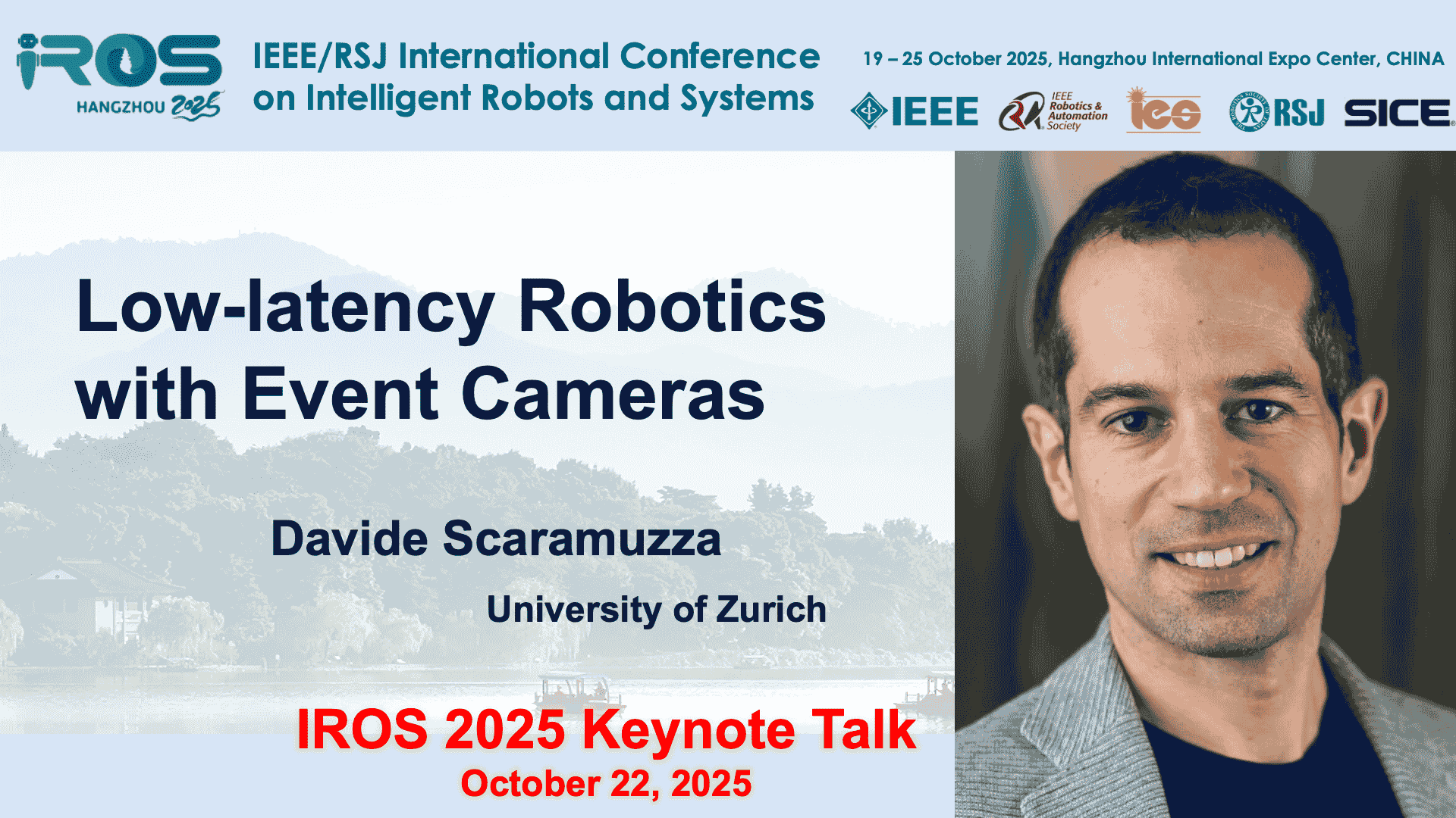In this keynote held at IROS 2025 Prof. Davide Scaramuzza shares the current development trends and application opportunities for event cameras, covering fields ranging from robotics to virtual reality and smartphones, while also exploring current challenges and future development directions link to the video recording.