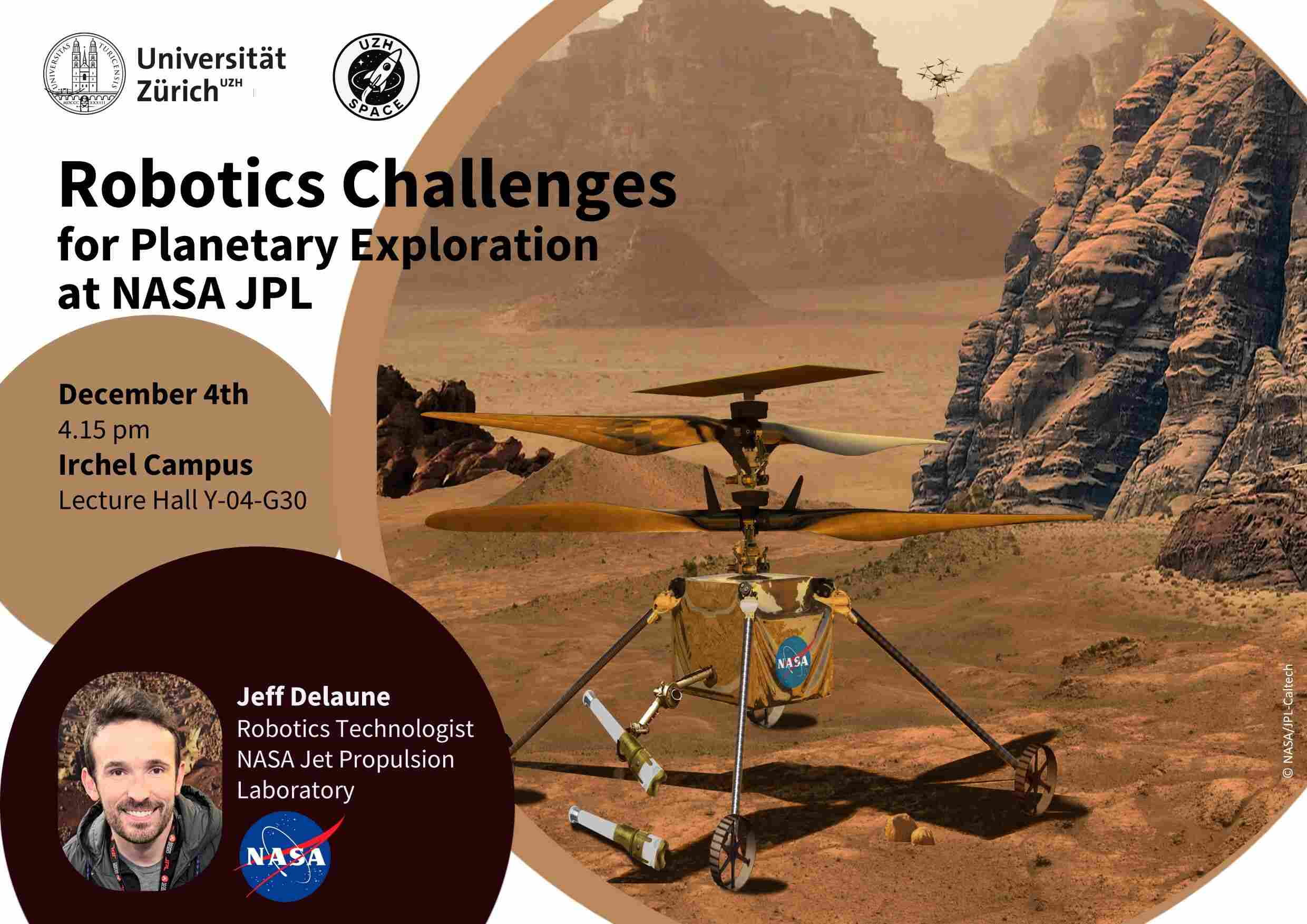 Robotics Challenges for Planetary Exploration at NASA JPL: The exploration of the Solar System presents very unique challenges to roboticists. In this talk, Jeff Delaune from the NASA Jet Propulsion Laboratory (JPL), will offer a perspective on what it means to develop the technology that enable these missions. He will also introduce some of the exciting next mission concepts that JPL is working on (Mars, Moon, Titan, Venus, and Enceladus) and how you can contribute to them Info.